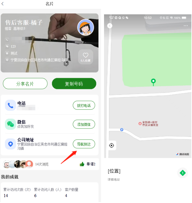 10,访问名片:可查看名片信息,发名片发放的是访问的这张名片,可收藏、点赞、分享该名片,复制手机号(如果名片没有填写手机号则不显示),微信号(如是上传二维码则弹出二维码图片),地址(如名片编辑有设置位置,可以点击跳转地图导航位置)