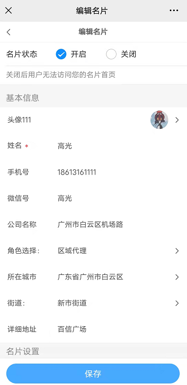 1,拥有权限的会员可在前端—会员中心看到名片入口,点击进入即生成了自己的名片,生成的名片名字默认为会员昵称,角色默认为会员,等级为会员等级,可在名片编辑处对自己的名片进行修改;只有在名片编辑处填写了手机号、微信号、地区,才可以在名片中心查看到相关信息
