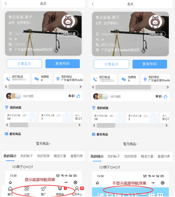 名片页面是否显示底部导航设置,默认显示
