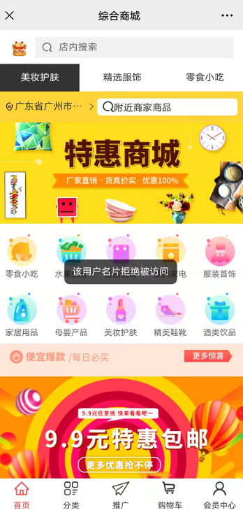 4,名片列表关闭名片、或前端会员关闭名片,关闭后会员正常进入自己名片中心,但其他会员则不能访问这个会员的名片,提示“该用户名片拒绝被访问”,如下图。
