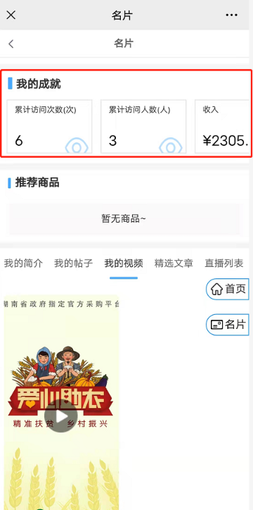 11,我的成就:显示的是名片会员的成就;显示的图片为名片会员上传的图片,如果名片会员选择的是招商员/招商中心角色,则会显示我推荐的所有商家;如果是其他角色则显示推荐的商品