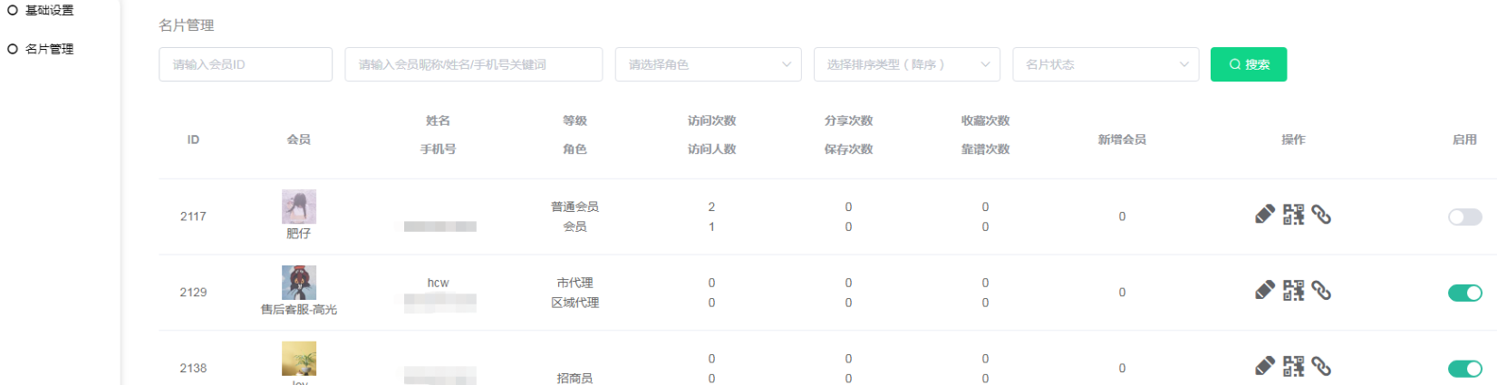 3,可按照会员id/昵称/姓名/手机号、角色、类型、名片状态进行筛选【靠谱次数为点赞次数】